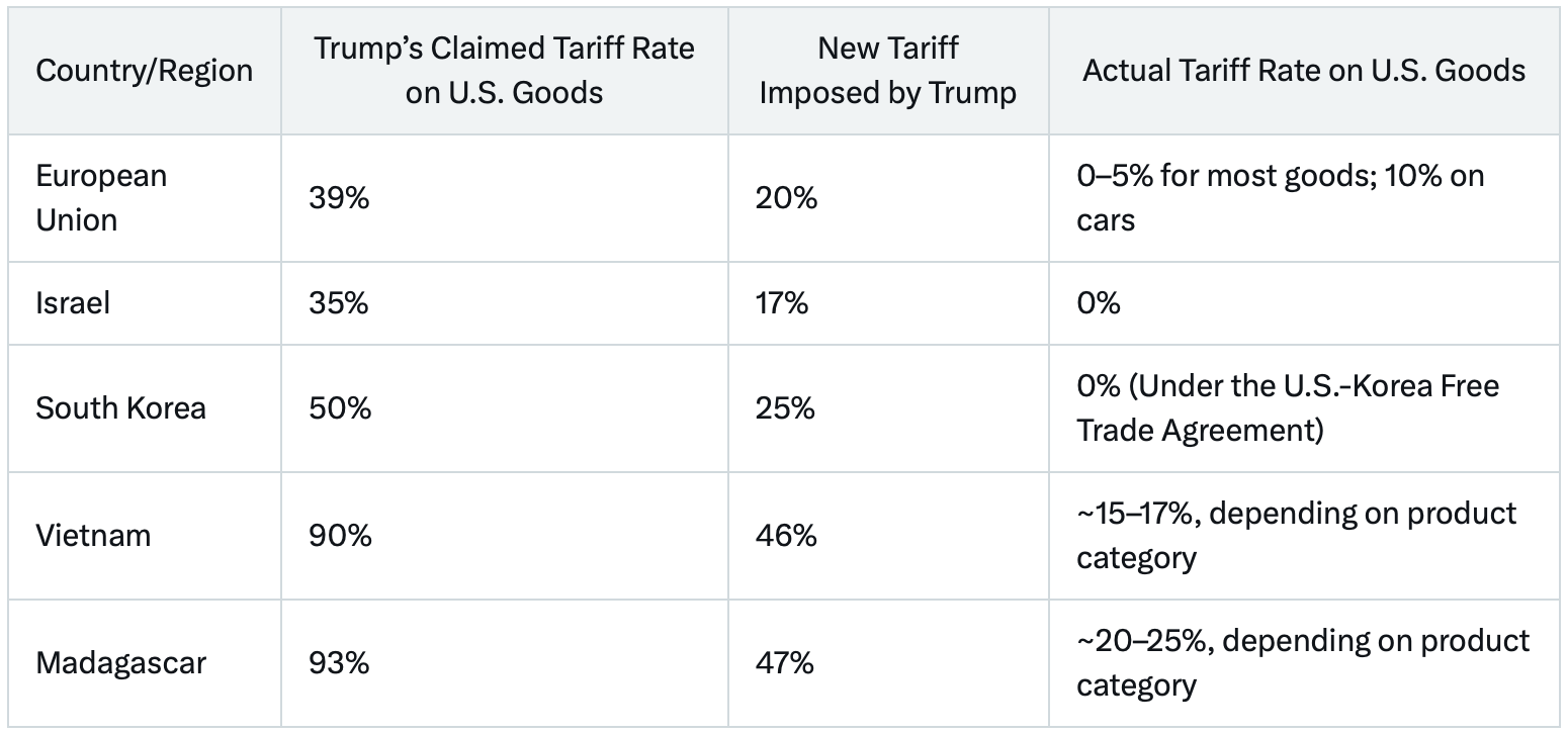 Trump’s tariffs aren’t truly reciprocal—they don’t mirror what other countries charge us. Instead, they’re cooked up from a formula: a country’s trade surplus with the U.S., divided by its exports to us, then halved. It’s arbitrary, not reflective of real tariff rates. Look at the numbers: